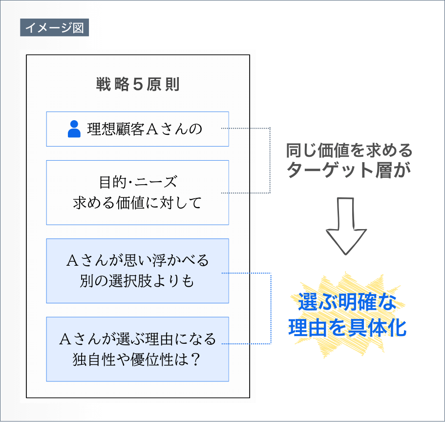 選ばれる理由をつくるというのは、「戦略策定」「差別化」「STP戦略」「コンセプト」「USP」「バリュープロポジション」 等の名称で紹介され、多くのマーケティング書籍や研修で毎日のように紹介されているとても大事な内容です。
