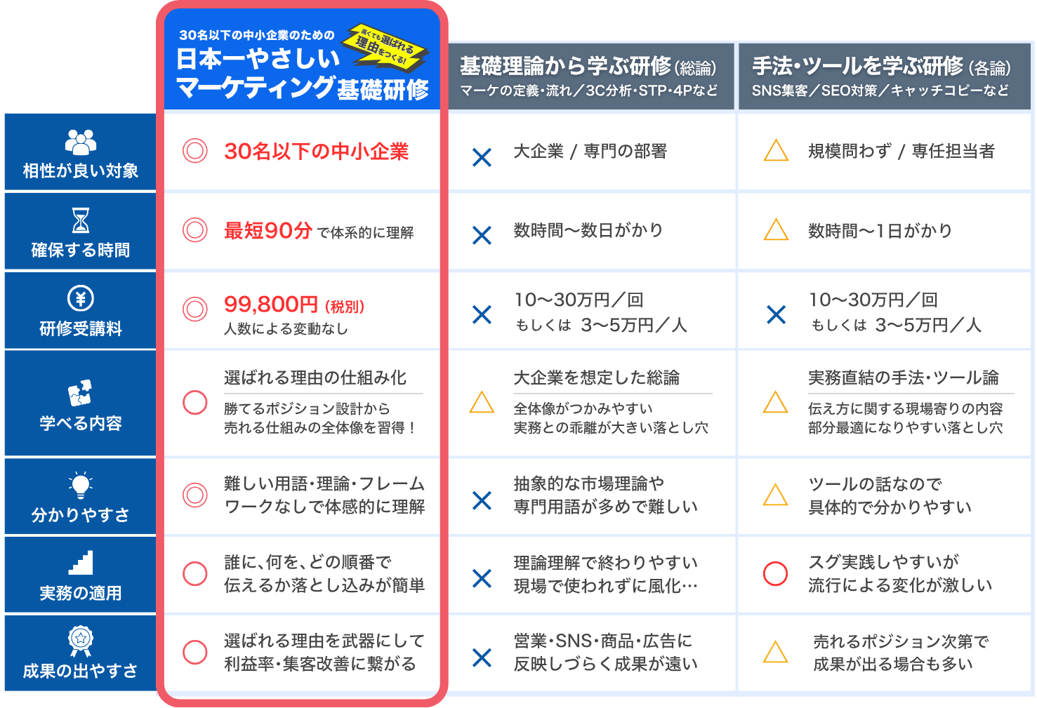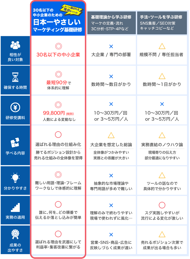 この研修の趣旨は、「市場の勝てるポジション取りで高くても選ばれる理由をつくり、シンプルに日常業務に落とし込む」ことにあります。そういった意味では、以下の企業様にとってはあまりお役に立てない内容です。また、「選ばれる理由」「戦略」「USP」「ブランドコンセプト」等のような概念的は内容ではなく、具体的なSNSのバズり方、広告運用の勘所、AIを活用したコンテンツ作成などの研修をお求めの企業様についても当プログラム「日本一やさしいマーケティング基礎研修」ではお役に立てません。