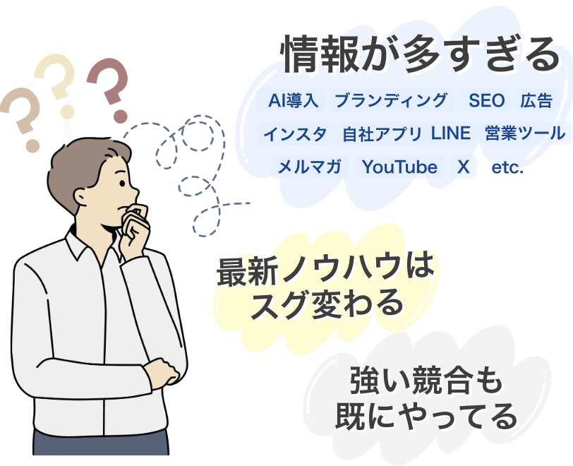選ばれる理由がない状態で SNS・広告・AI活用・ブランディング等に取り組んでも、発信が埋もれたり、実績や知名度で負けたり、価格競争に陥ってしまいます。この状態を「戦略なきマーケティング」と呼びます。