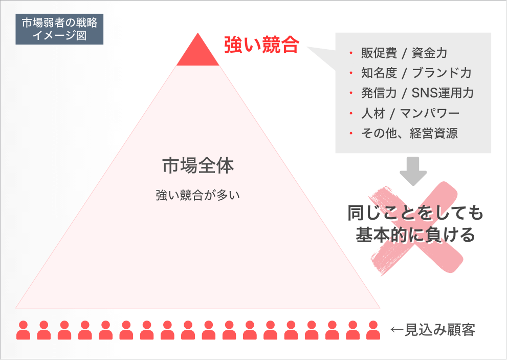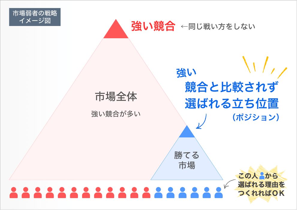 特定のお客様に対して、 選ばれる理由をつくれれば、市場の強い競合と価格・知名度・実績で比較されずに売れる状態が作れる!