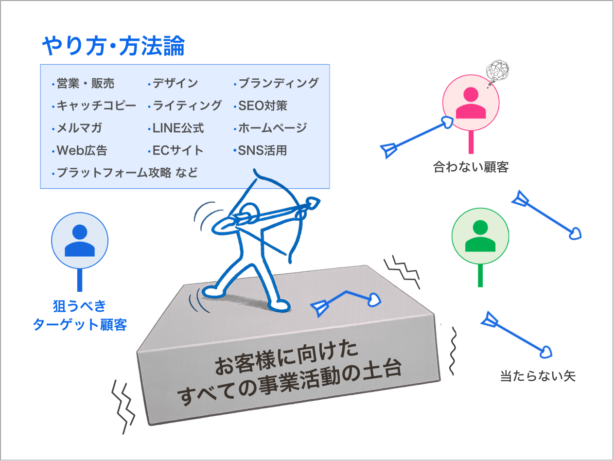 この土台が曖昧で不安定だと、誰に何を伝えれば売れるかが分からず、新しいノウハウ・テクニックに振り回されてしまいます。