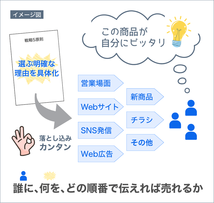 逆に、土台がしっかりすることによって、営業・販売、デザイン、ブランディング、キャッチコピー等々、あらゆる場面で適切なターゲットに価値を届けることが容易になります。